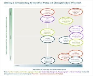 Die Innovationen, die die Autor:innen hier gefunden haben, umfassen unter anderem neue Formen der Studieneingangsphase und Anerkennungspraxis, die Vermittlung berufsrelevanter Fähigkeiten und von Transferkompetenzen, den Einsatz von Microcredentials, Peer Learning und Learning Analytics sowie neue Professoren-Modelle und agile Netzwerk- und Organisationsstrukturen. Das wirkt dann gemessen an den aufrüttelnden Vorgaben fast schon wieder bescheiden.