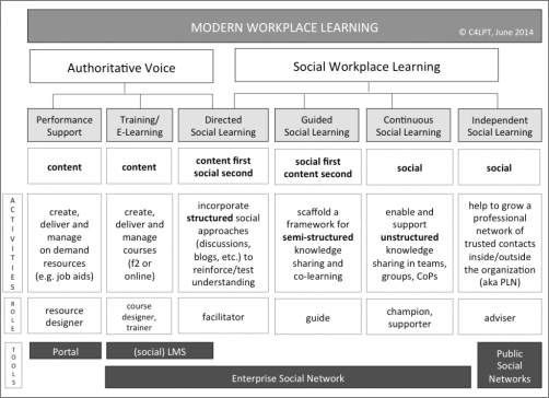 Die „4 D’s of Learning“, die Jane Hart uns vorschlägt, lauten: Didactics (formal learning/ being taught), Doing (experiential learning/ learning from work), Discourse (social learning/ interacting…