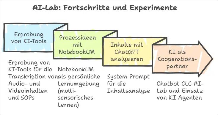 „Ziel des AI-Lab ist es, die Lerninhalte des CLC MOOC 2024 neu aufzubereiten und KI-basierte Tools für personalisierte Lernprozesse zu testen.“ Das AI-Lab sind eine Gruppe von Interessierten, die im Dezember letzten Jahres die Arbeit aufgenommen haben. Joachim Niemeier (Corporate Learning Community) berichtet jetzt, wie bzw. mit welchen Aufgaben und Tools man in der Zwischenzeit an die Kursmaterialien herangegangen ist. Dabei rückt die KI als Kooperationspartner offensichtlich immer mehr in den Vordergrund. Ich bin jedenfalls gespannt, wie diese Lernreise weiter geht.