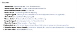 Im Mittelpunkt des BarCamps standen vor allem Fragen und Erfahrungen zum Einsatz von KI in Prozessen des Wissenstransfers (bzw. Expert Debriefing). Hier ein Überblick über die angebotenen Sessions: