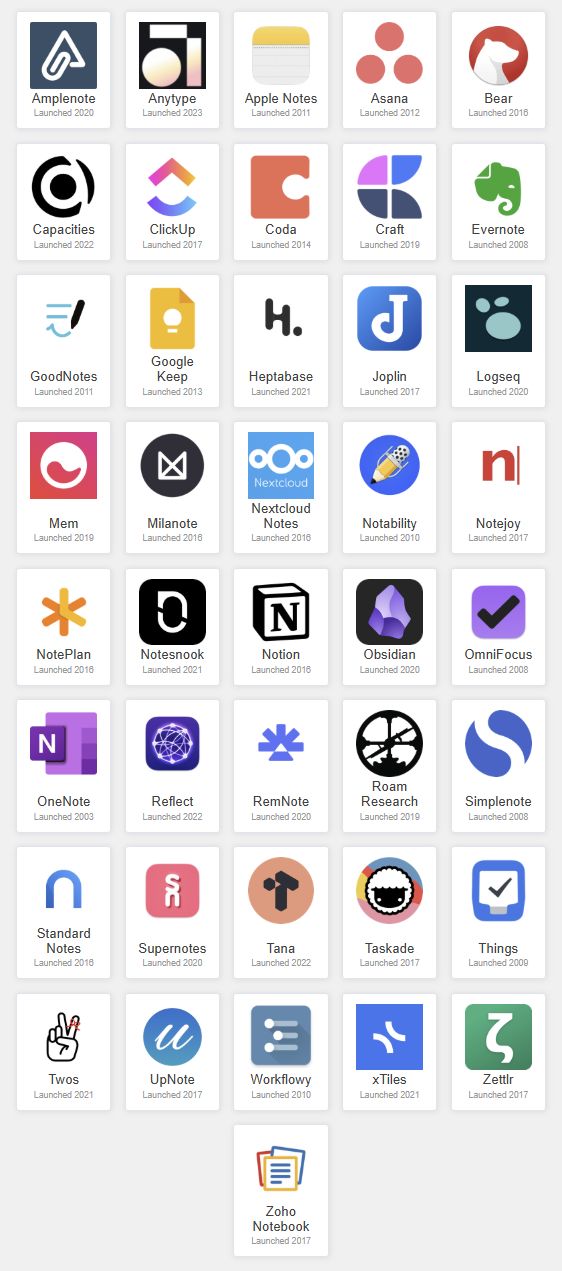 Simon Dückert wies kürzlich auf diese nützliche Übersicht über Note Taking-Apps hin. Sie umfasst neben den üblichen Verdächtigen (Obsidian, Evernote, OneNote, Notion usw.) viele weitere Tools, ist aktuell, informiert über Features und bietet direkte Vergleiche an – kurz: „Screenshots, feature lists, and pricing for popular note taking apps“. By the way, mein derzeitiger Favorit ist Obsidian.