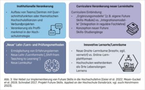 Die Autorinnen sprechen zumindest vier Hebel an, um Future Skills erfolgreich in die Hochschullehre zu integrieren: a) Future Skills institutionalisieren, b) neue Lerninhalte curricular verankern, c) „neue“ Lehr-/Lern- und Prüfungsmethoden verwenden und weiterentwickeln; d) neue Lernumgebungen und Innovationsräume schaffen.