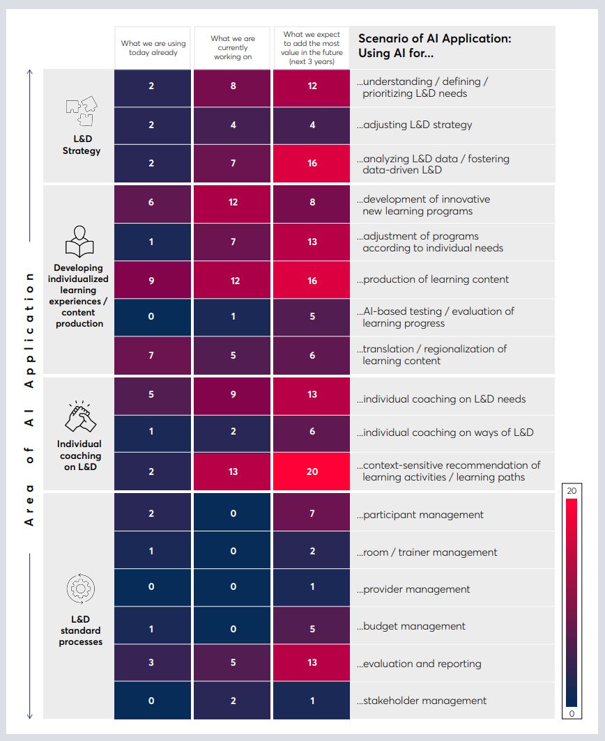 opportunistisch innerhalb von L&D-Abteilungen genutzt. … Die aktuellen und zeitnah möglich erscheinenden Einsatzfelder sind noch immer sehr davon geprägt, „mehr vom Gleichen“ zu liefern, und dies noch schnell und günstiger. Sprich: Lern-Contents einfach und zügig zu generieren bzw. zu übersetzen.“