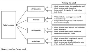 Zweitens finden die Autor:innen in Working Out Loud genau diese Prinzipien agilen Lernens wieder: „Overall, WOL fits the characteristics of agile learning and might therefore provide a fruitful path to assess its contribution to professional learning.“